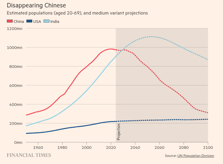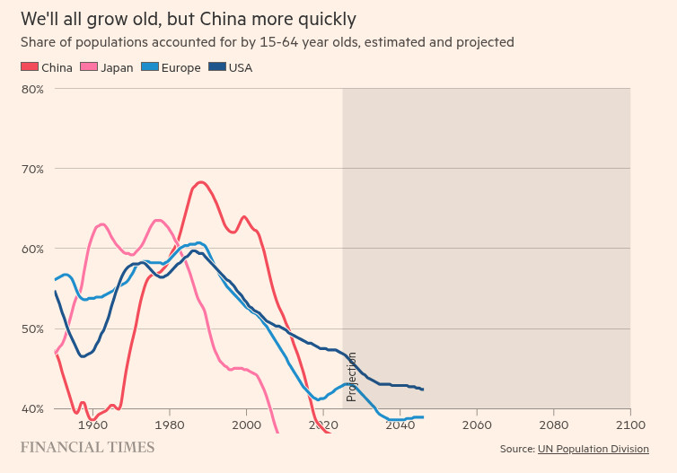 По данным Департамента экономики и социальных дел ООН по народонаселению, доля населения в возрасте 15-64 лет достигла пика в 2012 году на уровне 73 процентов (сейчас она колеблется около 70 процентов), но в ближайшие пятьдесят лет она, как ожидается, упадет ниже половины, что снизит ее показатели по сравнению с аналогичными показателями в США, Европе и даже Японии.