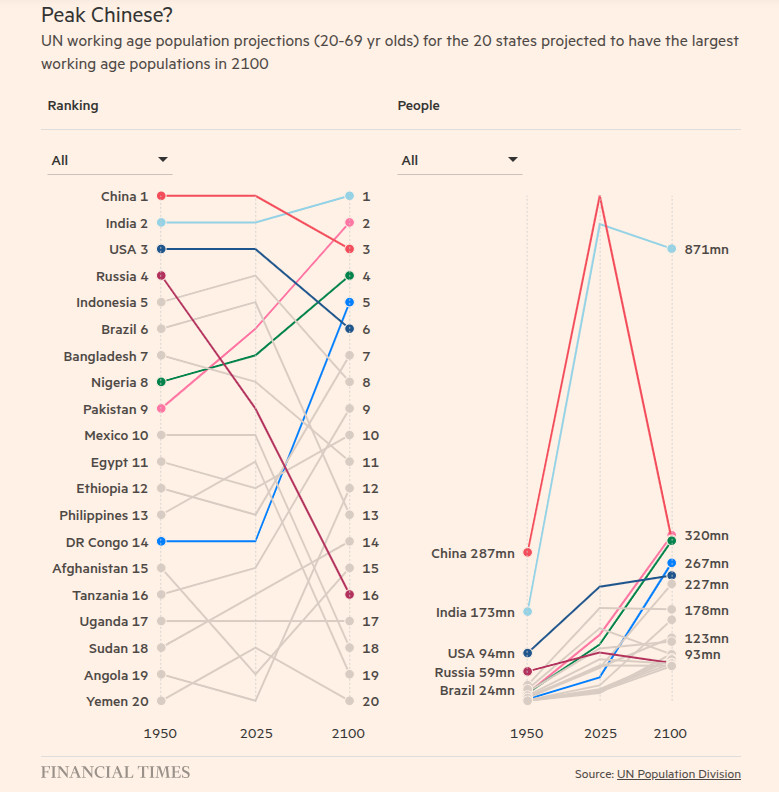 На диаграмме слева показан рейтинг двадцати государств, которые, по оценкам ООН, будут иметь наибольшее трудоспособное население к 2100 году, а также показано их относительное положение в 1950 и 2025 годах.