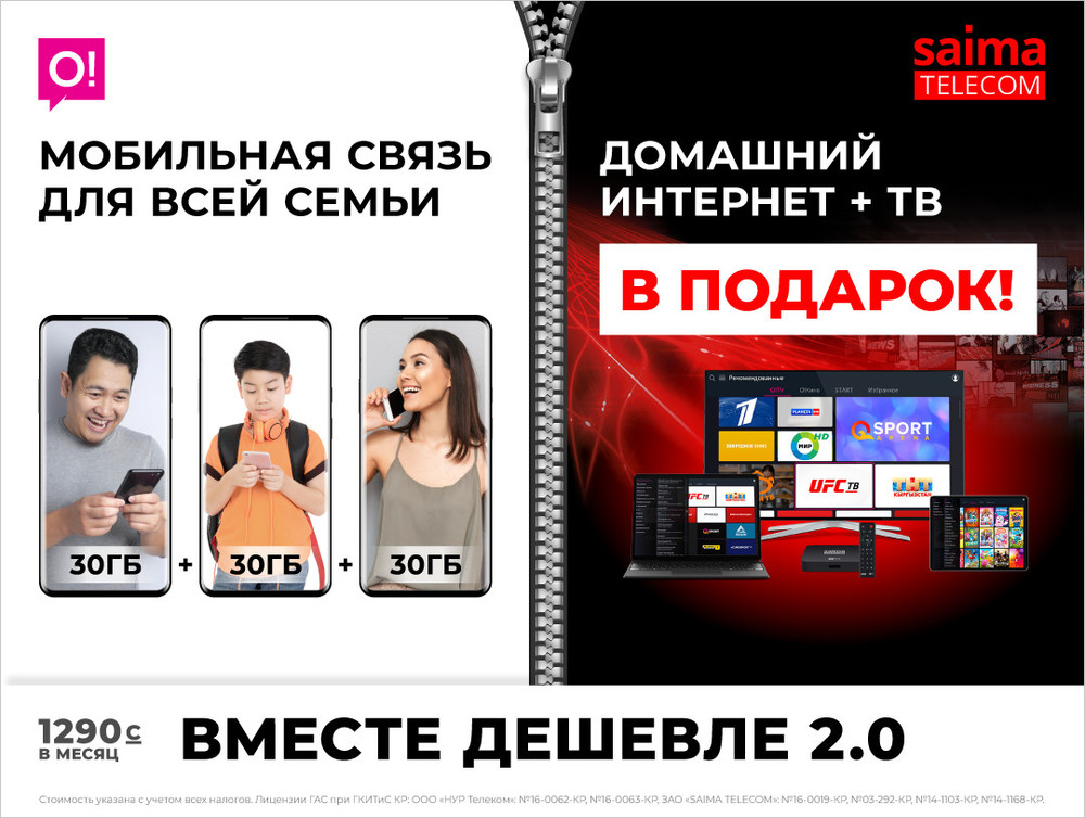 Подключение к тарифу и получение подарка доступно только в г. Бишкек и Чуйской области при условии возможности подключения вашего дома к проводному интернету Saima Telecom. Обязательно заключение договора на 1 год (12 оплаченных периодов) с ежемесячным внесением абонентской платы за тариф. Телевидение предоставляется в рамках пакета «O!TV Премиум» в услуге O!TV, только при условии оплаченной абонентской платы за тариф. Телеканалы, содержание и контент в рамках услуги O!TV предоставляются ОсОО «Диас ТВ». Стоимость указана с учетом всех налогов. Лицензии ГАС при ГКИТиС КР: ООО «НУР Телеком»: №16-0062-КР, №16-0063-КР, ЗАО «Saima Telecom»: №16-0019-КР, №03-292-КР, №14-1103-КР, №14-1168-КР. Информация действительна на момент публикации: 24.06.2021.