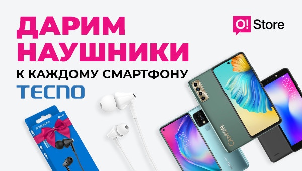 При покупке смартфона Tecno в магазинах O!Store вы получите фирменные наушники в подарок.