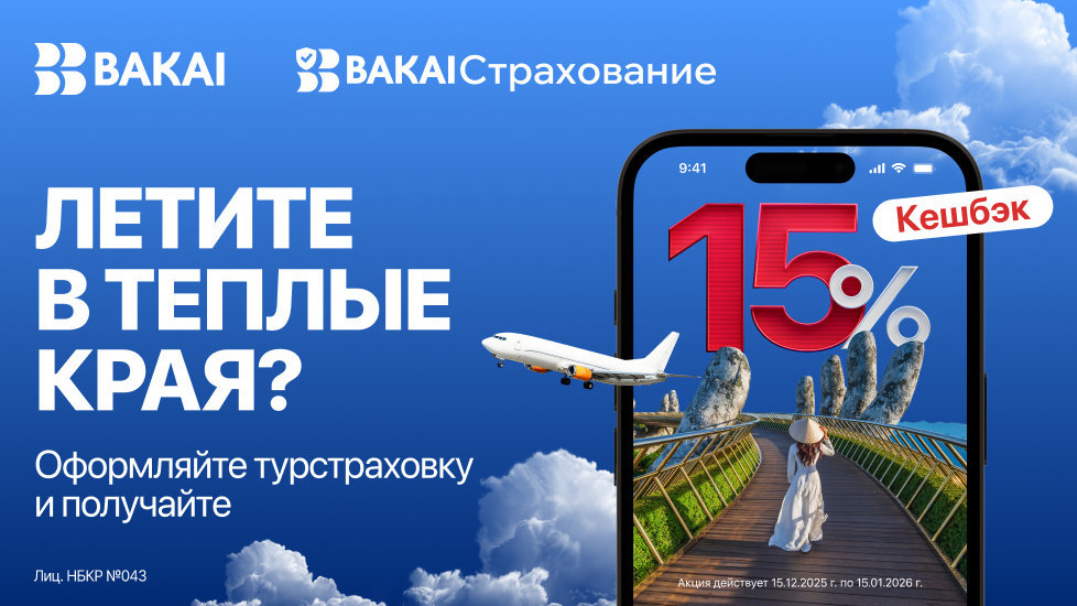 С 15 декабря 2025 года по 15 января 2026 года оформляйте туристическую страховку через мобильное приложение BAKAI и получайте кешбэк 15% реальными деньгами от стоимости полиса обратно на счёт сразу после покупки.