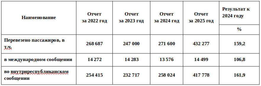 Показатели пассажирских перевозок за последние четыре года представлены ниже. Как видно из представленных данных, в 2025 году общий объем пассажирских перевозок значительно увеличился по сравнению с предыдущими годами, при этом наибольший рост наблюдается во внутриреспубликанских сообщениях.